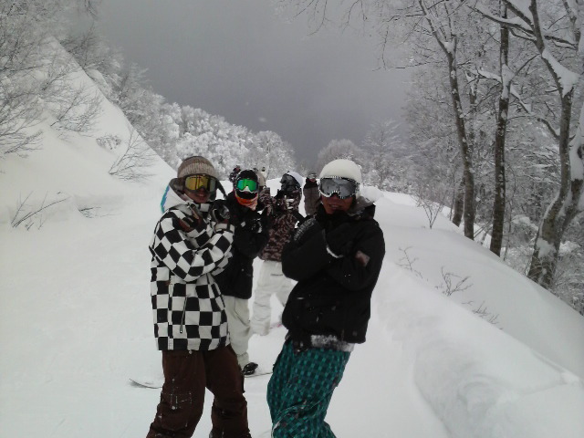 続き・・・・・ もう1組 合流したチームがいるので紹介します 愛知県名古屋市のSHOP 『ABEAM』です TQXの事ならこの人にお任せ その名はユーキャン!(写真右側) 今回は大勢のお客さんとのツアー中だったので 飛び入り参加しちゃいました ナイスはパウダーコースを教えて頂き! あざーーーーす! そして 新旧TQXライダーも参戦! (左側:TORQREX所属 斉藤丹) (右側:SCOOTER所属 岡島弘晃)